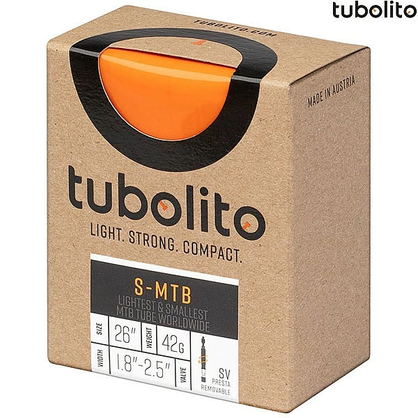 Even lighter and more compact – the perfect spare tube: Due to a removable valve, S-Tubo-MTB’s can be rolled up to an extremely space saving size (diameter 3.5 x 5cm). Despite a light overall weight of only 45g (29″) they are as puncutre resistant as standard rubber tubes for everyday riding and are also perfect for use as a spare tube for riders using a tubeless system. Ready for disc brakes.